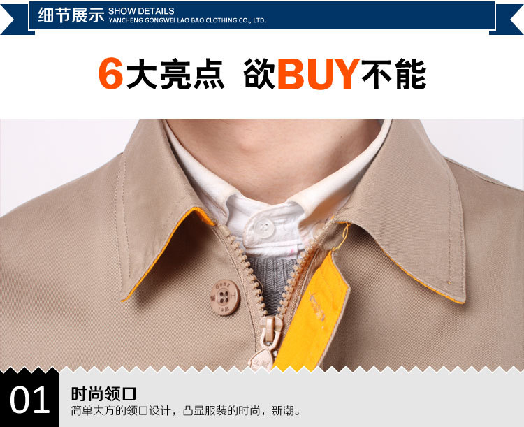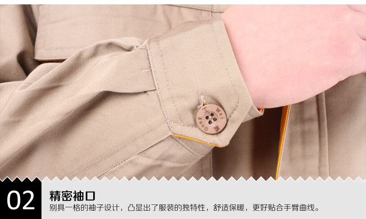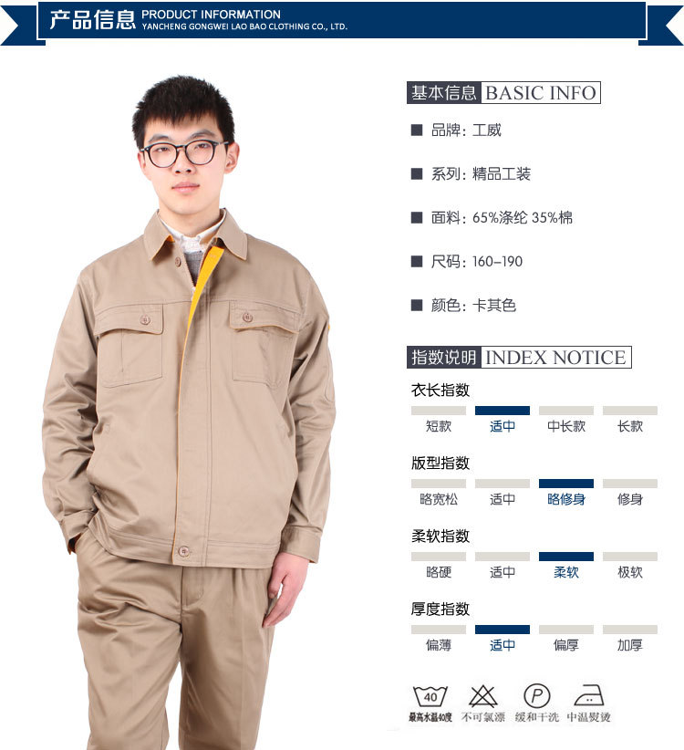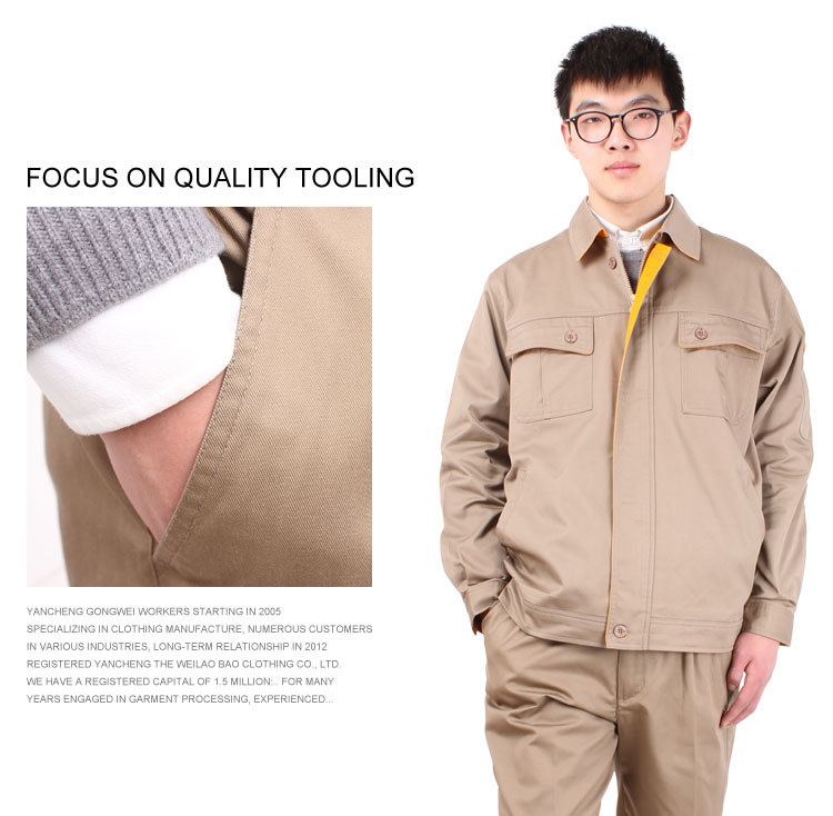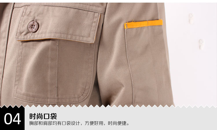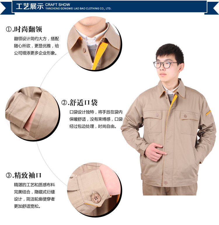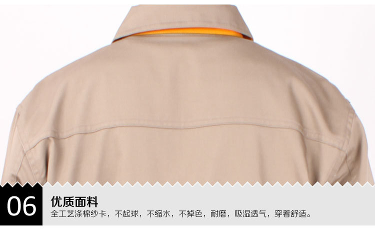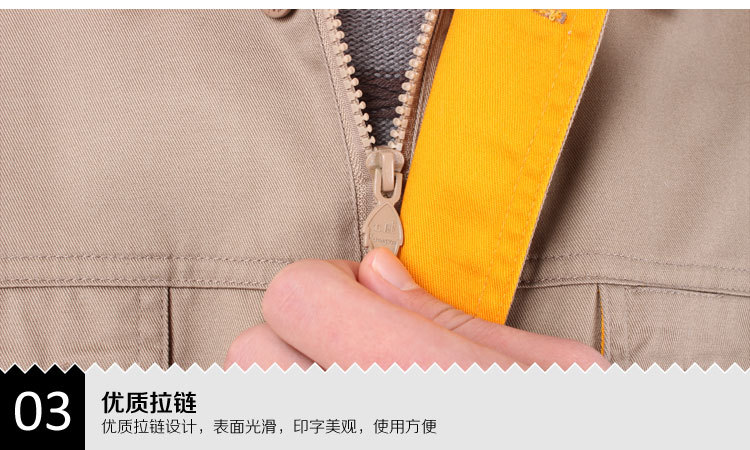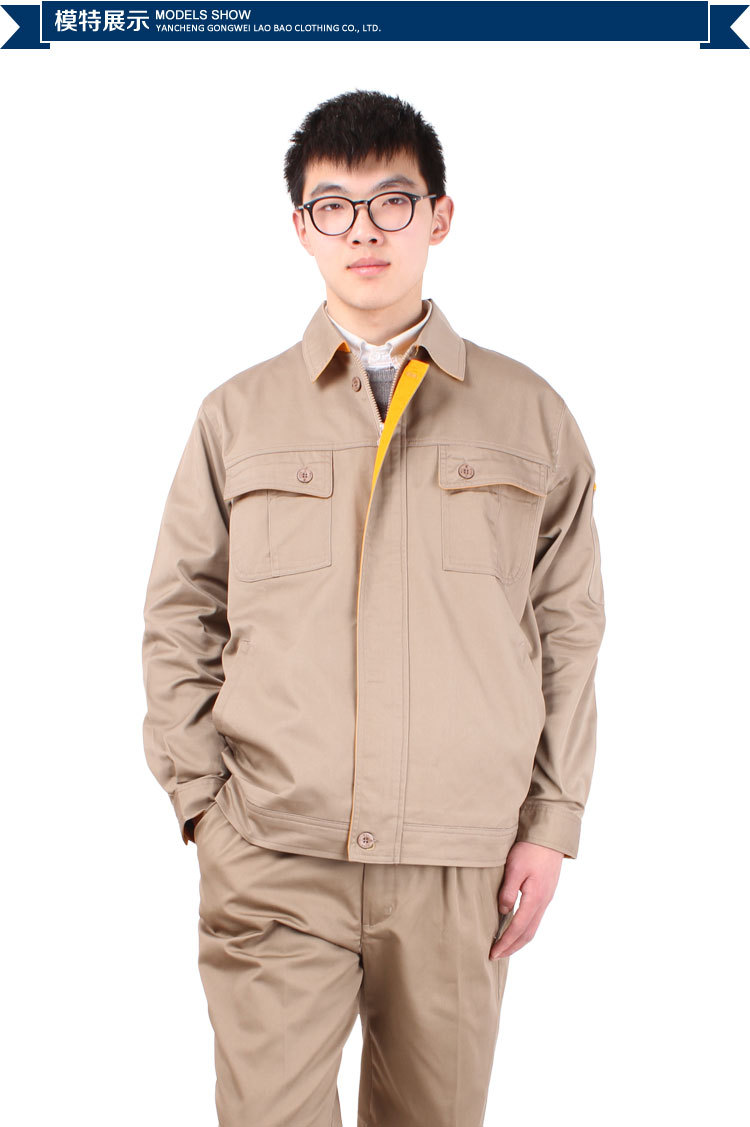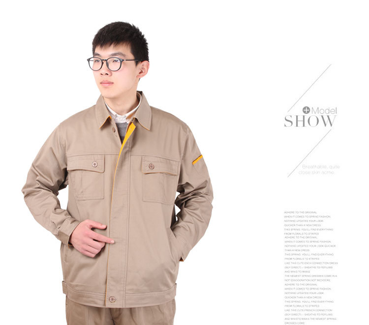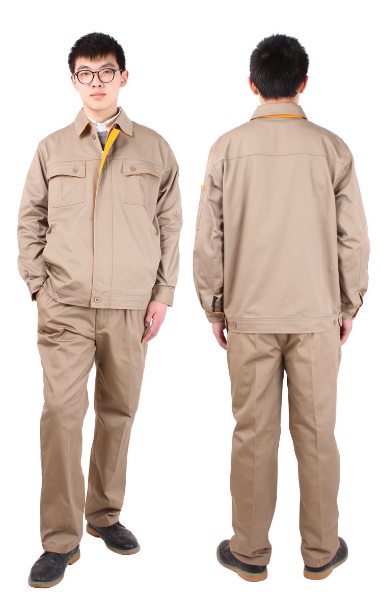名稱:春秋勞保工作服 顏色:卡其色拼亮黃 材質(zhì):加厚型滌棉紗卡 特點:面料不起球、不褪色、不縮水