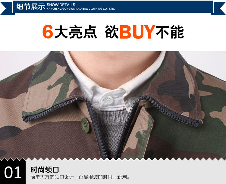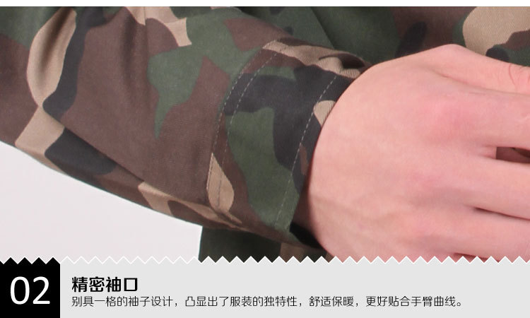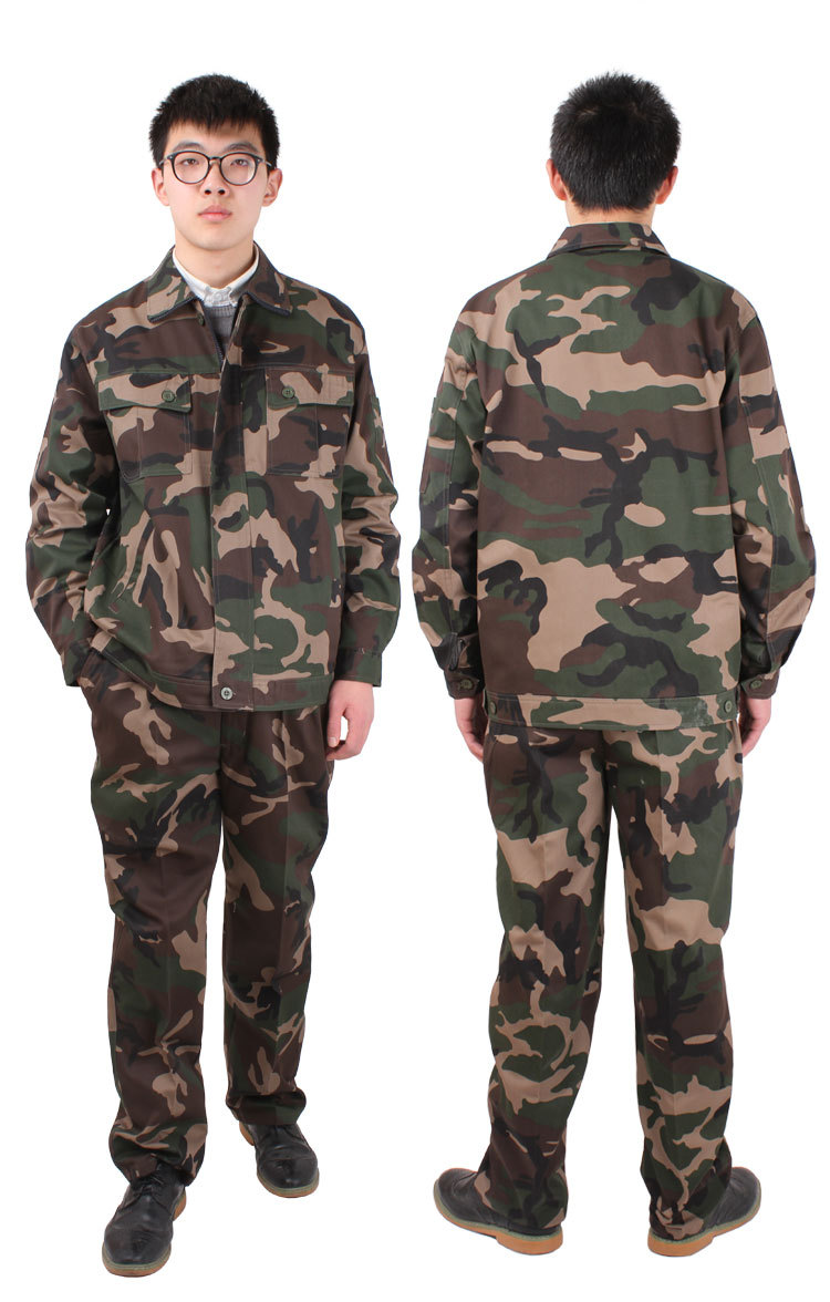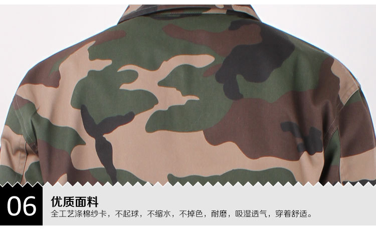 名稱:春秋迷彩勞保工作服 顏色:軍綠派迷彩 材料:加厚型紗卡 特點:不起球、不縮水、不褪色