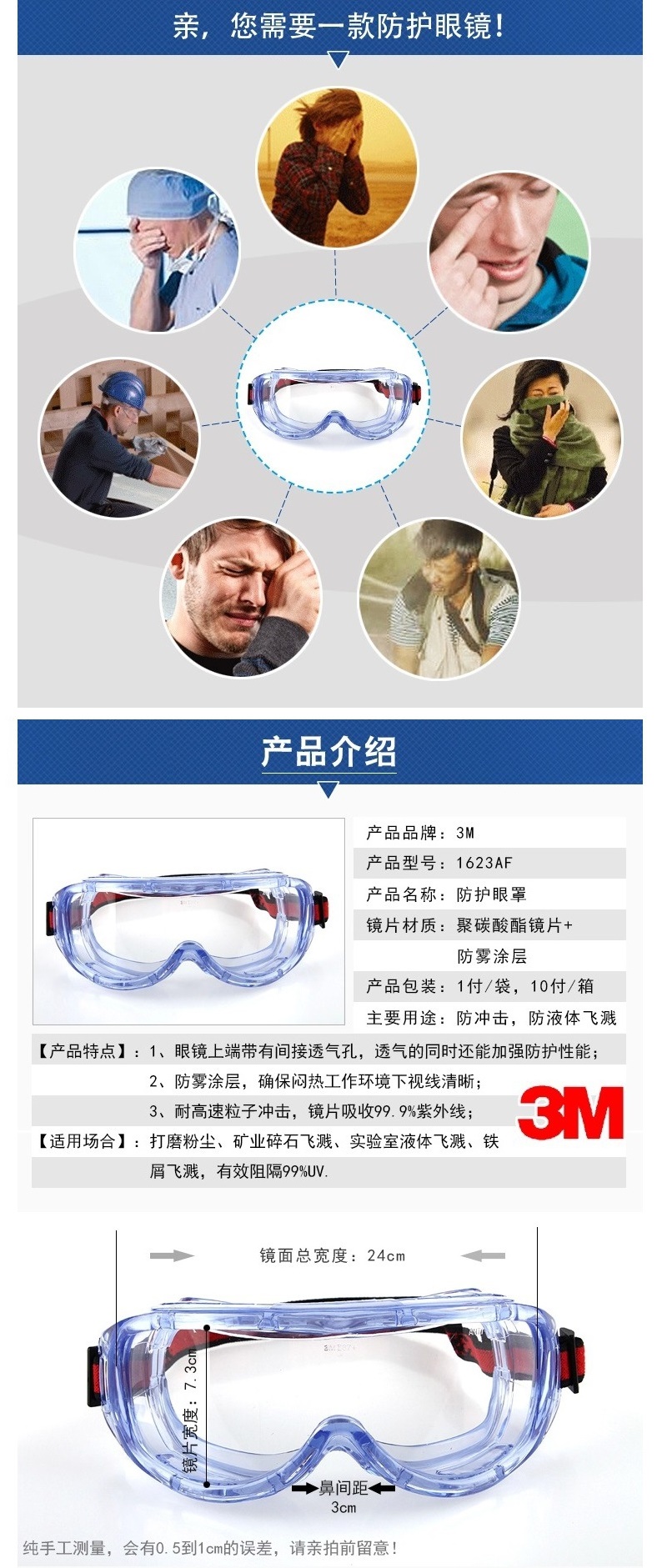 3M防護(hù)眼罩1623AF 防霧護(hù)目鏡 抗沖擊 防塵防沙勞保防濺