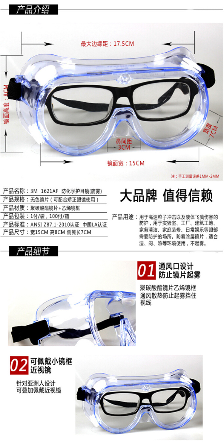 3M 1621AF護(hù)目鏡防化學(xué)物防霧防塵防沙抗沖擊防護(hù)眼罩